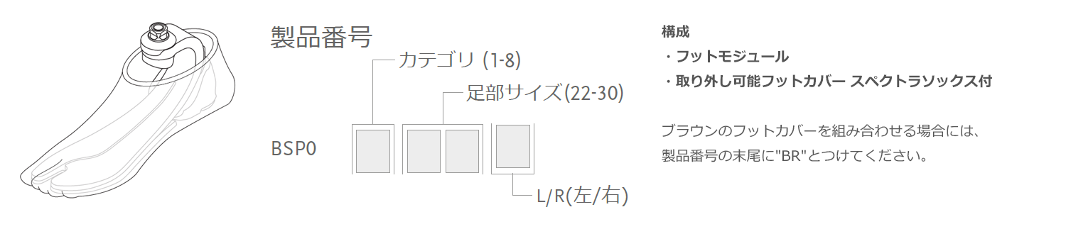 *x=カテゴリ(1-8)y=足部サイズ(22-30)z=L/R(左/右)※カテゴリ3、足部サイズ26、右の場合はBSP0326Rとなります。