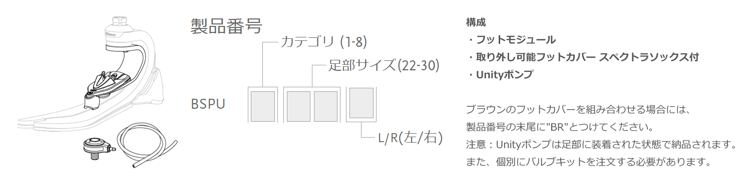 *x=カテゴリ(1-8)y=足部サイズ(22-30)z=L/R(左/右)※カテゴリ3、足部サイズ26、右の場合はBSPU326Rとなります。
