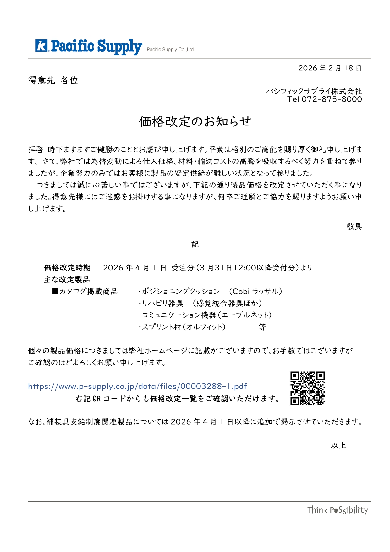 個々の製品価格につきましては弊社ホームページに記載がございますので、お手数ではございますが、ご確認のほどよろしくお願い申し上げます。なお、補装具支給制度関連製品については2026年4月1日以降に追加で掲示させていただきます。