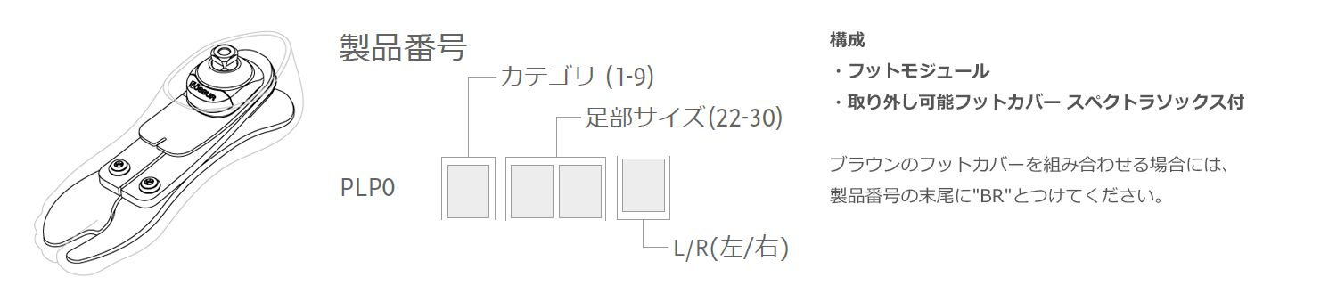 *x=カテゴリ(1-9)y=足部サイズ(22-30)z=L/R(左/右)※カテゴリ3、足部サイズ26、右の場合はPLPU326Rとなります。