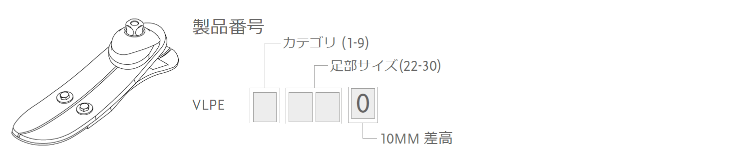 *x=カテゴリ(1-9)y=足部サイズ(22-30)※カテゴリ3、足部サイズ26の場合はVLPE3260となります。