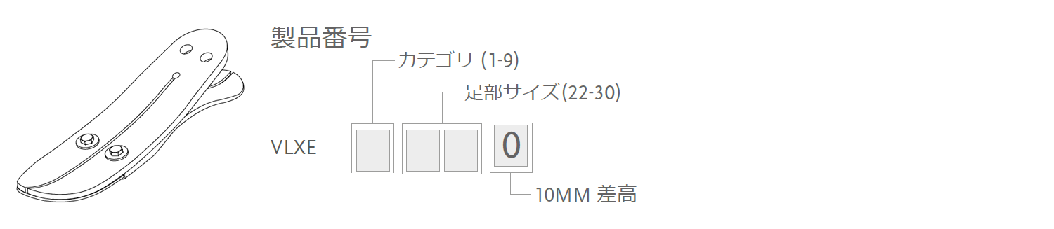 *x=カテゴリ(1-9)y=足部サイズ(22-30)※カテゴリ3、足部サイズ26の場合はVLXE3260となります。