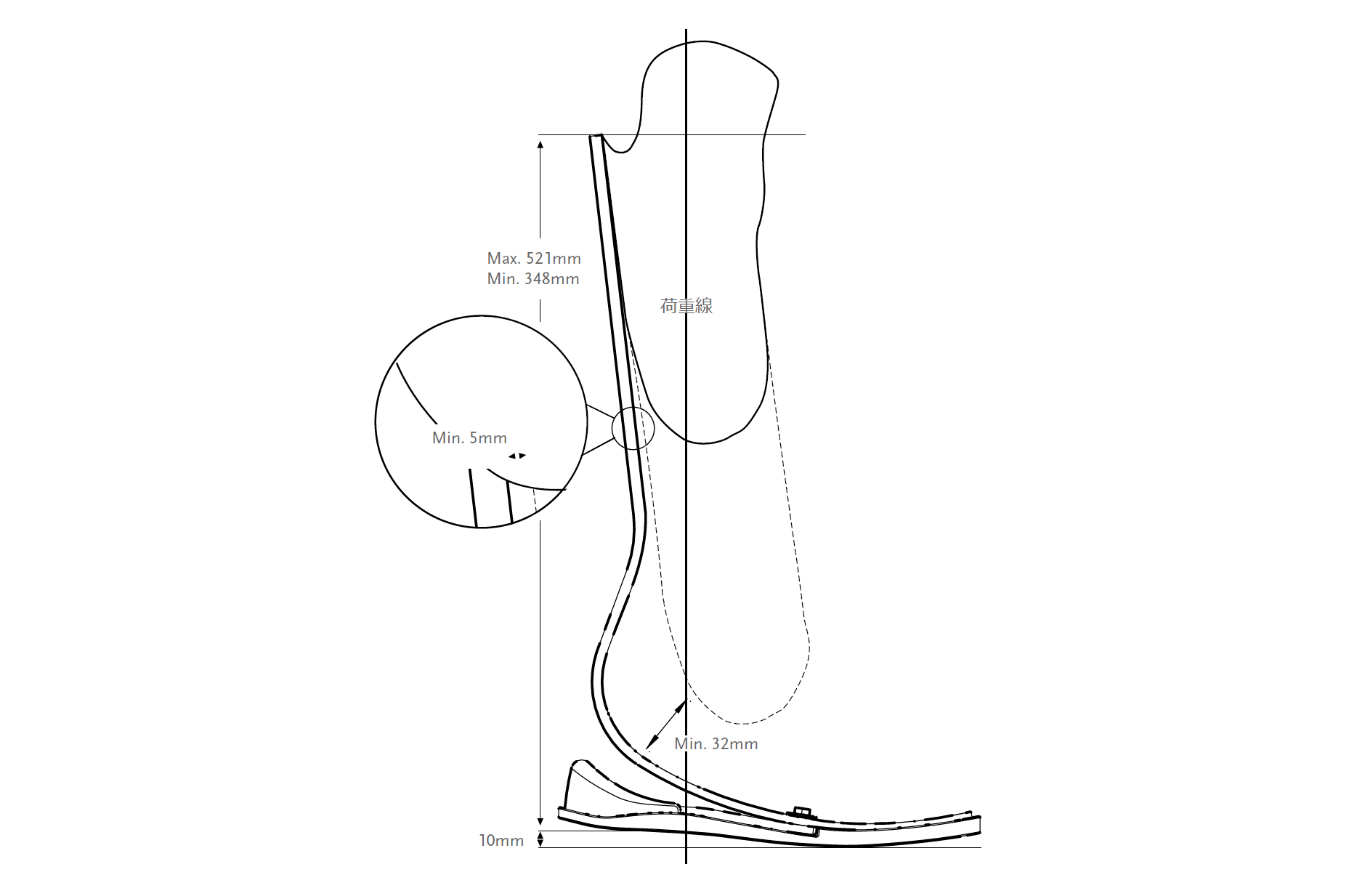 | 最小構造的高さ | 348mm(ソケットから足部までのクリアランス:最小32mm) |