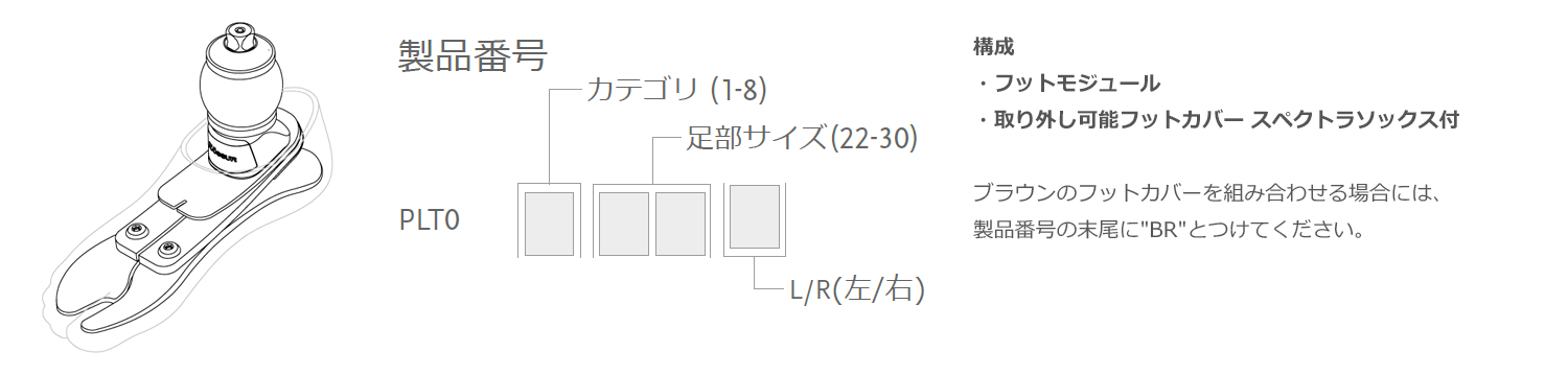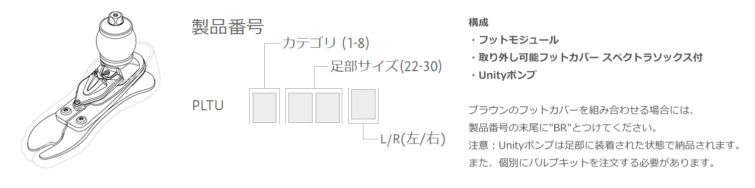 *x=カテゴリ(1-9)y=足部サイズ(22-30)z=L/R(左/右)※カテゴリ3、足部サイズ26、右の場合はPLTU326Rとなります。