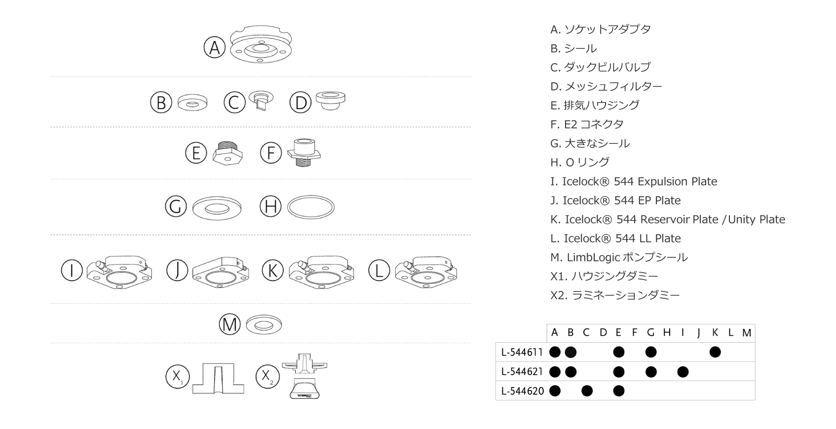 | L-544611 ※ | Icelock 544 ユニティプレートキット(ソケットアダプタ含む) | ○ | ○ | ユニティバキュームシステムとIcerossシールインライナー | グレー、黒 | 136kg | 216g | 25.5mm |