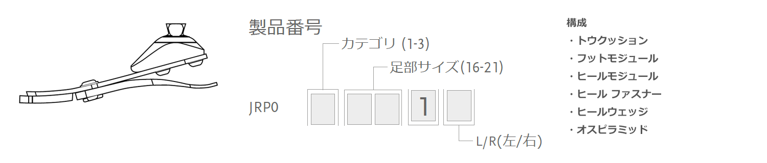 *x=カテゴリ(1-3)y=足部サイズ(16-21)z=L/R(左/右)※カテゴリ2、足部サイズ18、右の場合はJRP02181Rとなります。