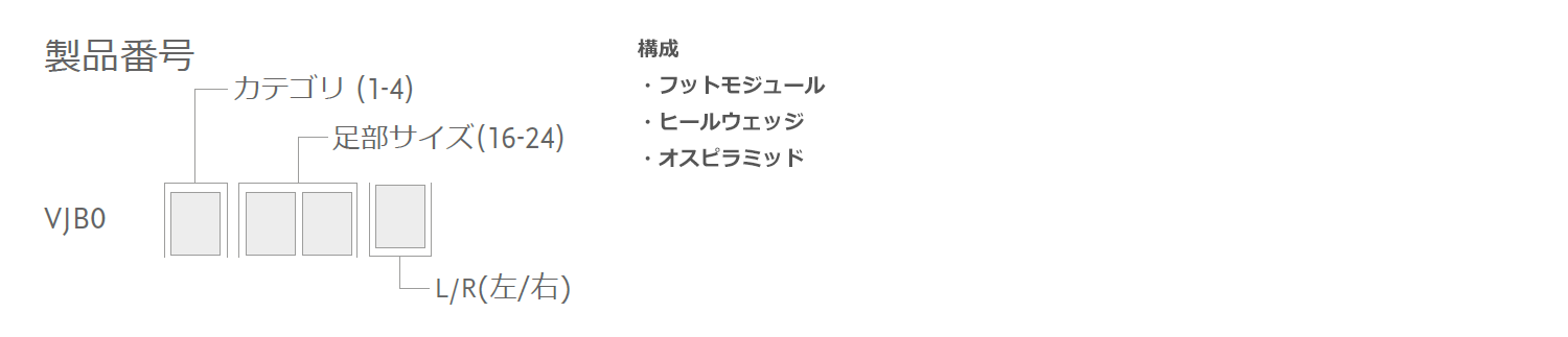 *x=カテゴリ(1-4)y=足部サイズ(16-24)z=L/R(左/右)※カテゴリ2、足部サイズ18、右の場合はVJB0218Rとなります。
