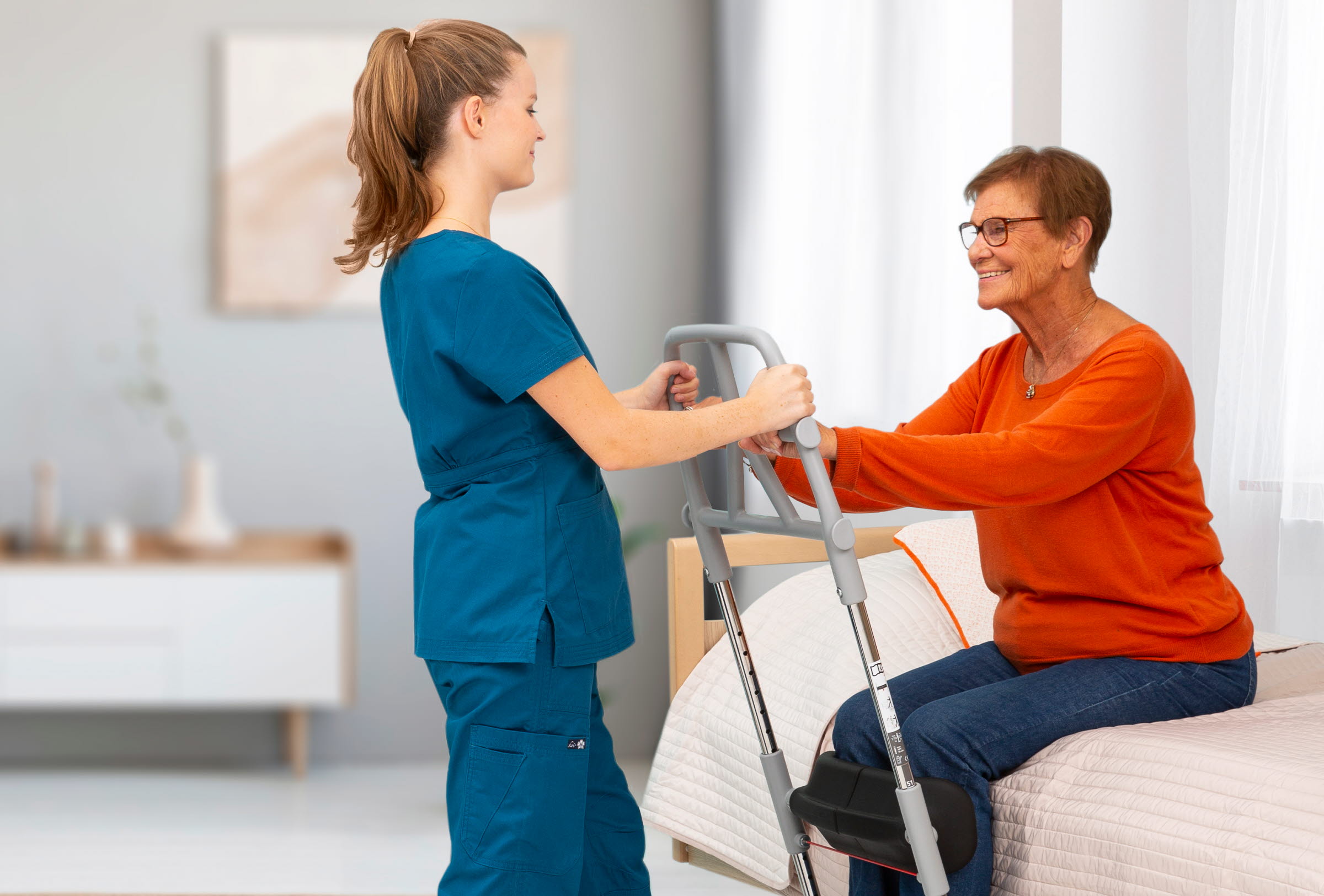グリップをしっかりと持って立ち上がることで、利用者は自身の筋力を働かせながら立ち上がります。