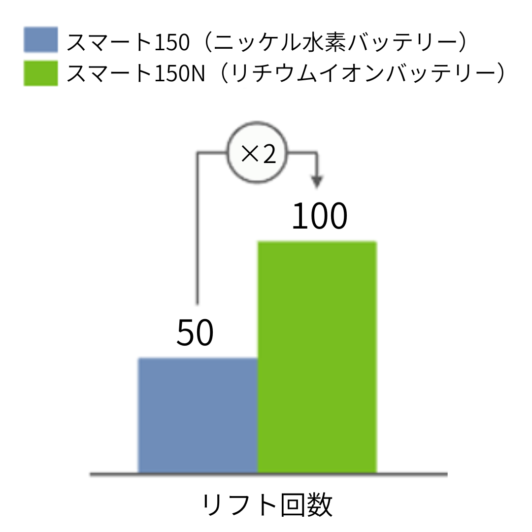 - 1回の充電で約2倍長持ち。充電の手間がぐっと減ります。 ※参考:1充電で 約100回(75㎏/50cm)昇降