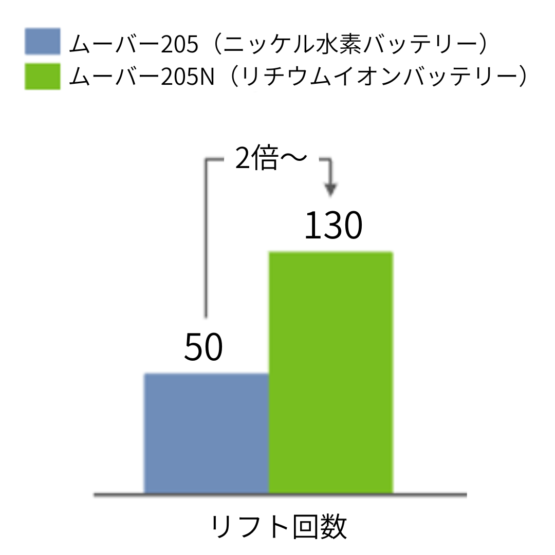 - 1回の充電で約2倍長持ち。充電の手間がぐっと減ります。 ※参考:1充電で 約130回(75㎏/50cm)昇降