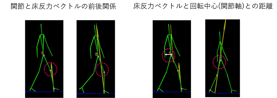 「関節と床反力ベクトルの前後関係」と、距離によりどれだけモーメントが必要になるかが規定される「床反力ベクトルと回転中心(関節軸)との距離」が関節モーメントをみる際のポイントです。