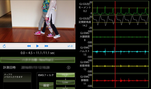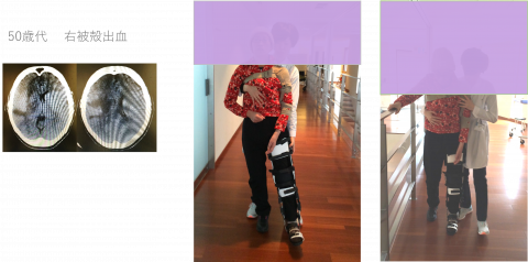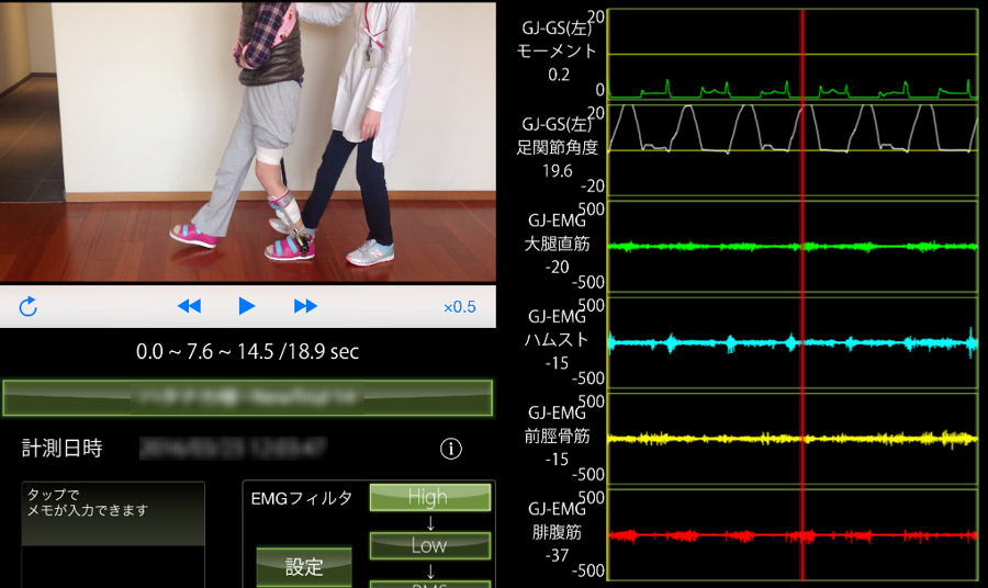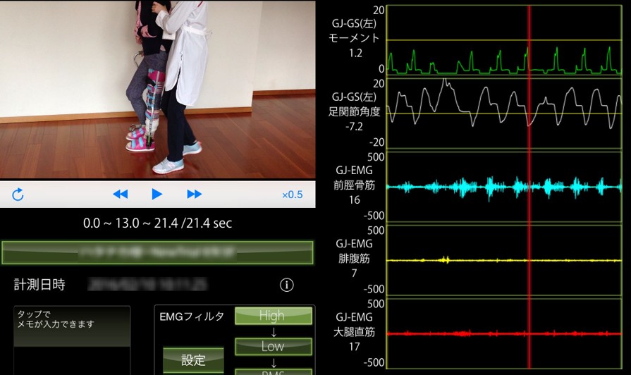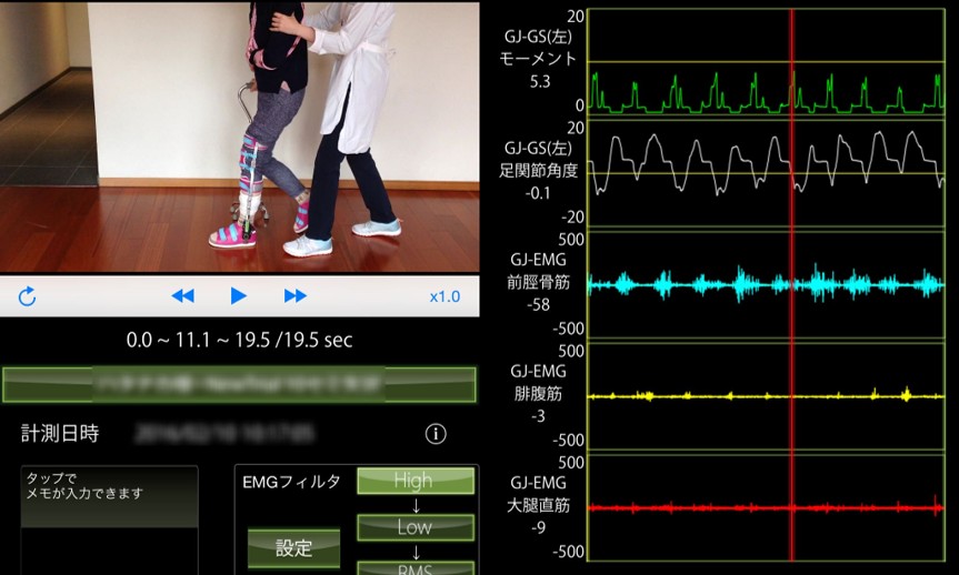 50歳代の右被殻出血の症例で、長下肢装具を着けて歩行トレーニングを開始した際の様子です。できるだけ介助を加えず歩行したところ、股関節周囲の固定性低下が観察されました。また、股関節の屈伸運動を引き出すために、後方から介助した状態で杖を使わず歩行トレーニングしているところをゲイトジャッジシステムで計測したところ、比較的一定のリズムで歩行できていますが、筋活動は乏しい状態でした。