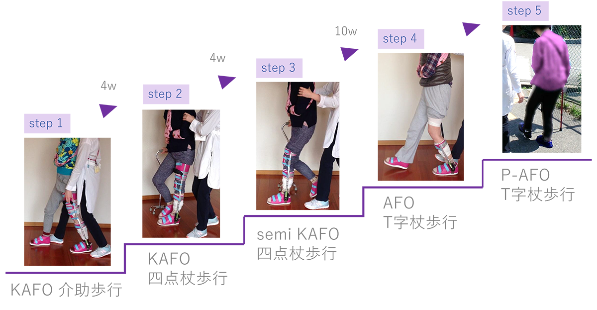 装具療法の流れは、長下肢装具を装着した介助歩行から始まり、カットダウンを経て、短下肢装具への移行、最終的には装具の離脱へと進みます。この流れは、装具や歩行補助具、歩行様式の観点から上図のように整理されます。