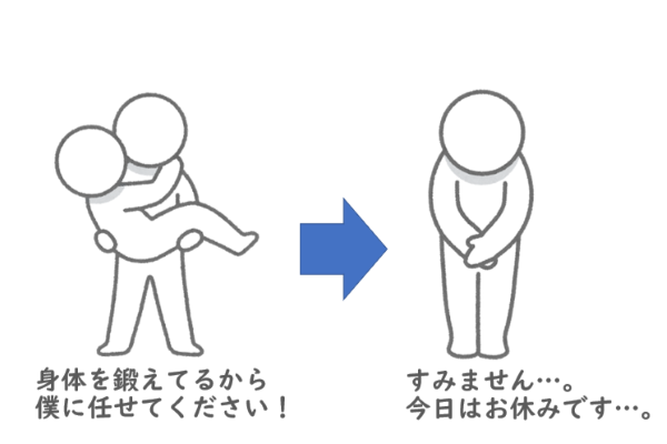 人手不足の問題を突き詰めると「一人介助になりやすい」ということだと思います。結果、休憩が十分に取れない、疲労により本来のパフォーマンスが発揮できないなどが発生することが容易に想像できます。また場合によっては特定のスタッフにしか出来ない仕事が増え、その人がいなくなると立ち行かなくなってしまう、といった状況にもなりかねません。