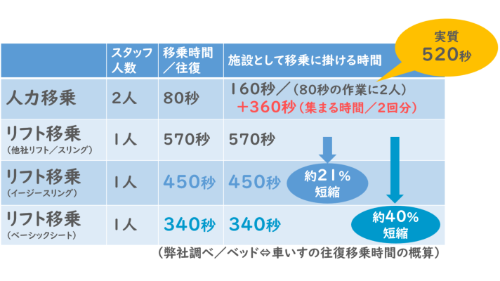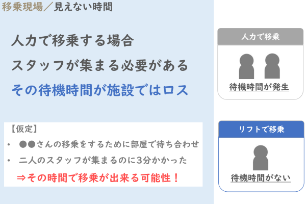 介護テクノロジー…、その中でも介護リフトのような機器を導入することで介助の時間が増えると思われている方も多いと思います。しかし、二人でやっていた作業が一人で出来るようになるのであれば、施設全体で見た場合そこまで大きく時間が増えることはありません。複数人による人力介助の場合 <見えない時間> が存在するためです。
