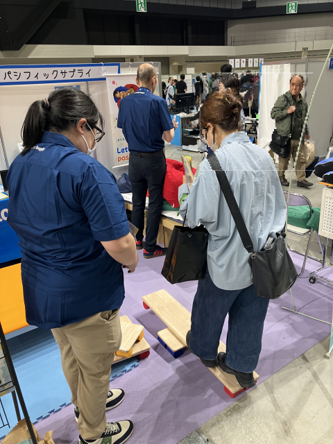 通常は裸足でご利用いただくのですが、展示会という場ですので、特別に「くつのままどうぞ」としたところ、いつも以上にお試しいただくことができました。「これ実物見たかったの~」というお声や、「これなら家でも使えるね」など。