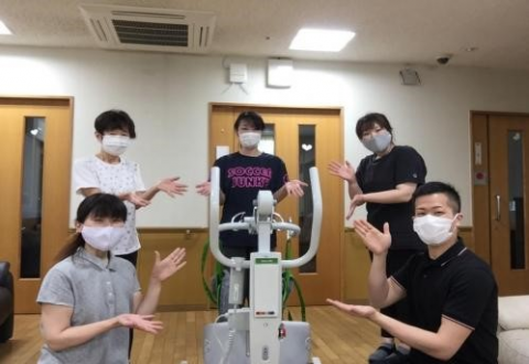 まずは職員同士でスタンディングリフトを体験しました。「へぇ、こんな感じなんだ!」「痛いとか怖いとかはないなぁ。」というのが分かったあとで、いよいよご入居者にお試しさせていただきました。身体全体がこわばっていて介助量も多いご利用者を対象にデモをしたところ、リフトを使う前後で筋緊張が変化し、肩や股関節の可動域が一気に改善していたんです!一度デモで使っただけで目に見える変化があり、私もびっくりしました!!もちろん職員も今まで抱えていた介助がなくなったので、当然腰に負担もかからないし、しっかり立位が保持されるので尿取りパットがきれいに付けられるとの感想でした。でも何よりご利用者の変化に立ち会った職員は感動して…そのあと、この時の動画を、常務理事、企画・財務部長、施設長、副施設長に見せて回りました(笑)